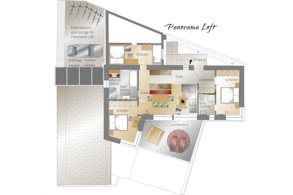 Süd-Dachterrasse 20qm mit Holz-Sitzgruppe und Ruheliegen